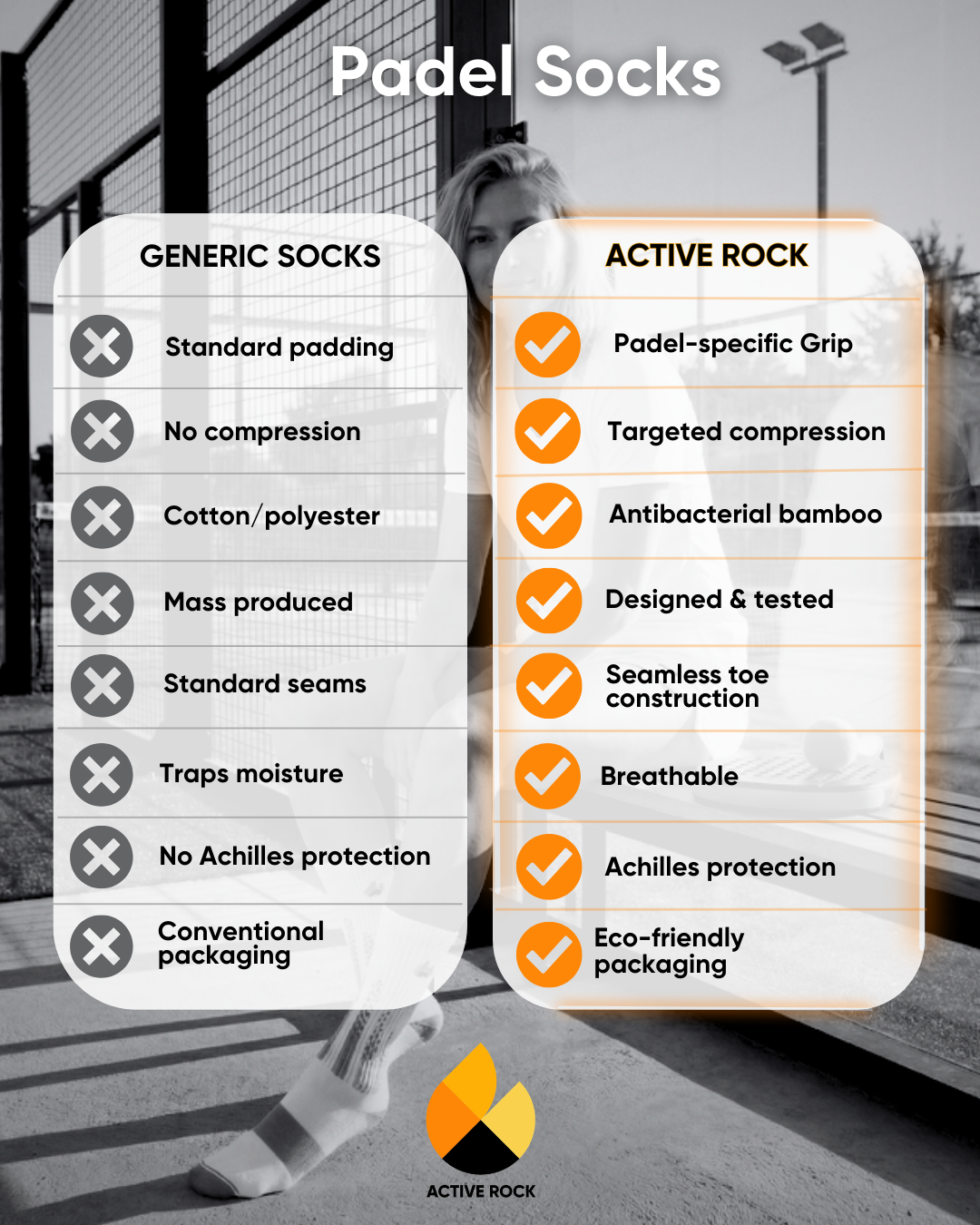 Erleben Sie den Unterschied mit Active Rock – unsere Padel-Socken sind für Sportler entwickelt, die in jedem Match ihr Bestes geben wollen, egal ob Sie nach einem Vibraphon greifen oder zum Netz sprinten. Im Gegensatz zu herkömmlichen Socken bieten Active Rock Padel-Socken sportspezifischen Grip, gezielte Kompression im Mittelfußbereich und den Komfort antibakterieller Bambusfasern.